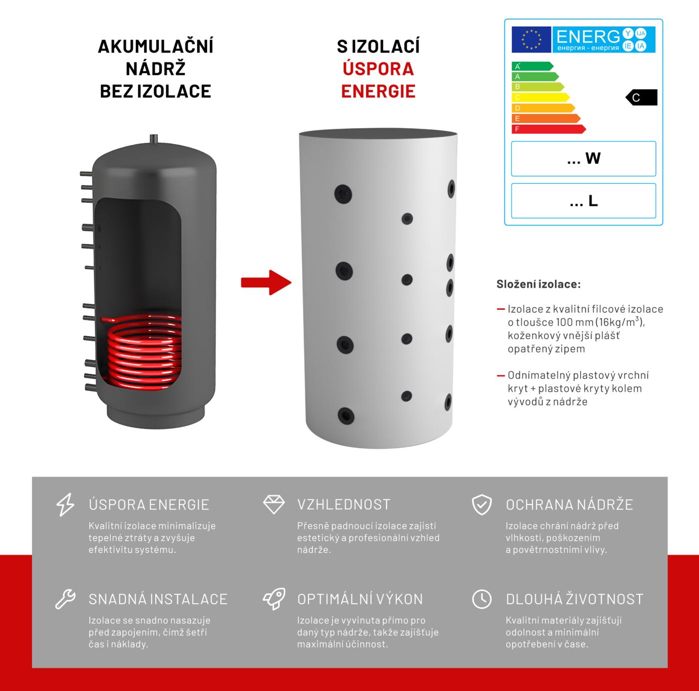 - Volitelné příslušenství: Izolace z kvalitní filcové izolace o tloušce 100 mm (16kg/m³) a odnímatelný kryt opatřený zipem.